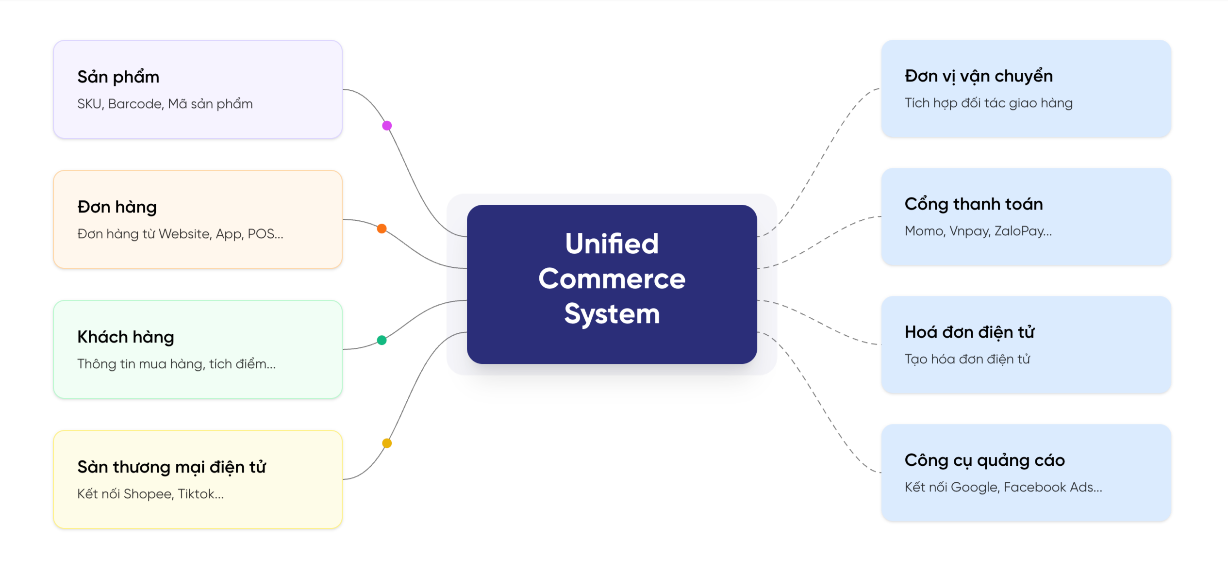 Khác với Omni-channel (đa kênh) chỉ dừng lại ở việc có mặt trên nhiều nền tảng, Unified Commerce System kết nối tất cả các kênh bán hàng, kho hàng và dữ liệu khách hàng vào một nền tảng duy nhất.