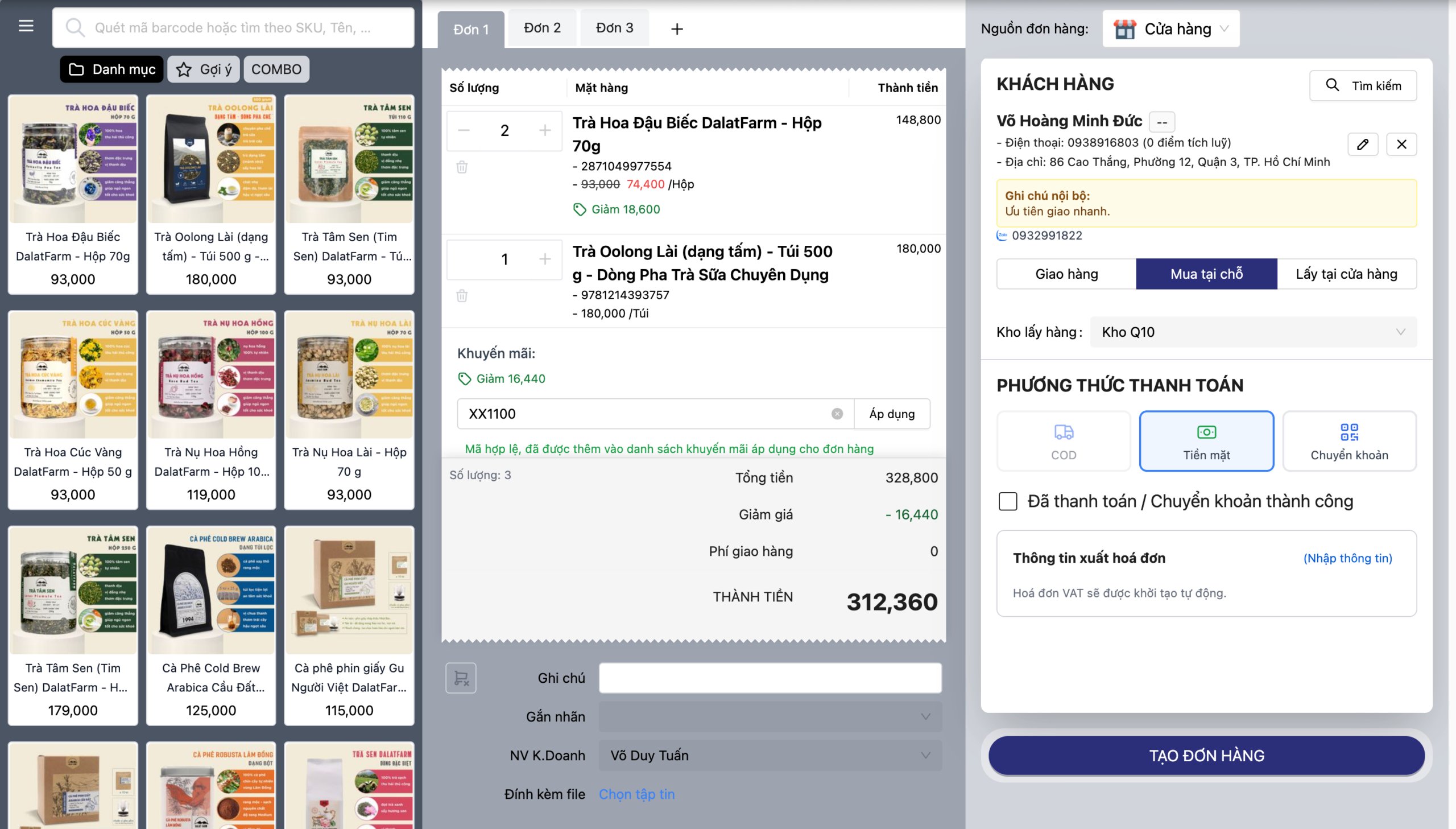 Cập nhật dữ liệu: Ngay khi nhấn “Tạo đơn hàng”, dữ liệu sẽ tự động trừ kho và ghi nhận doanh thu vào báo cáo.