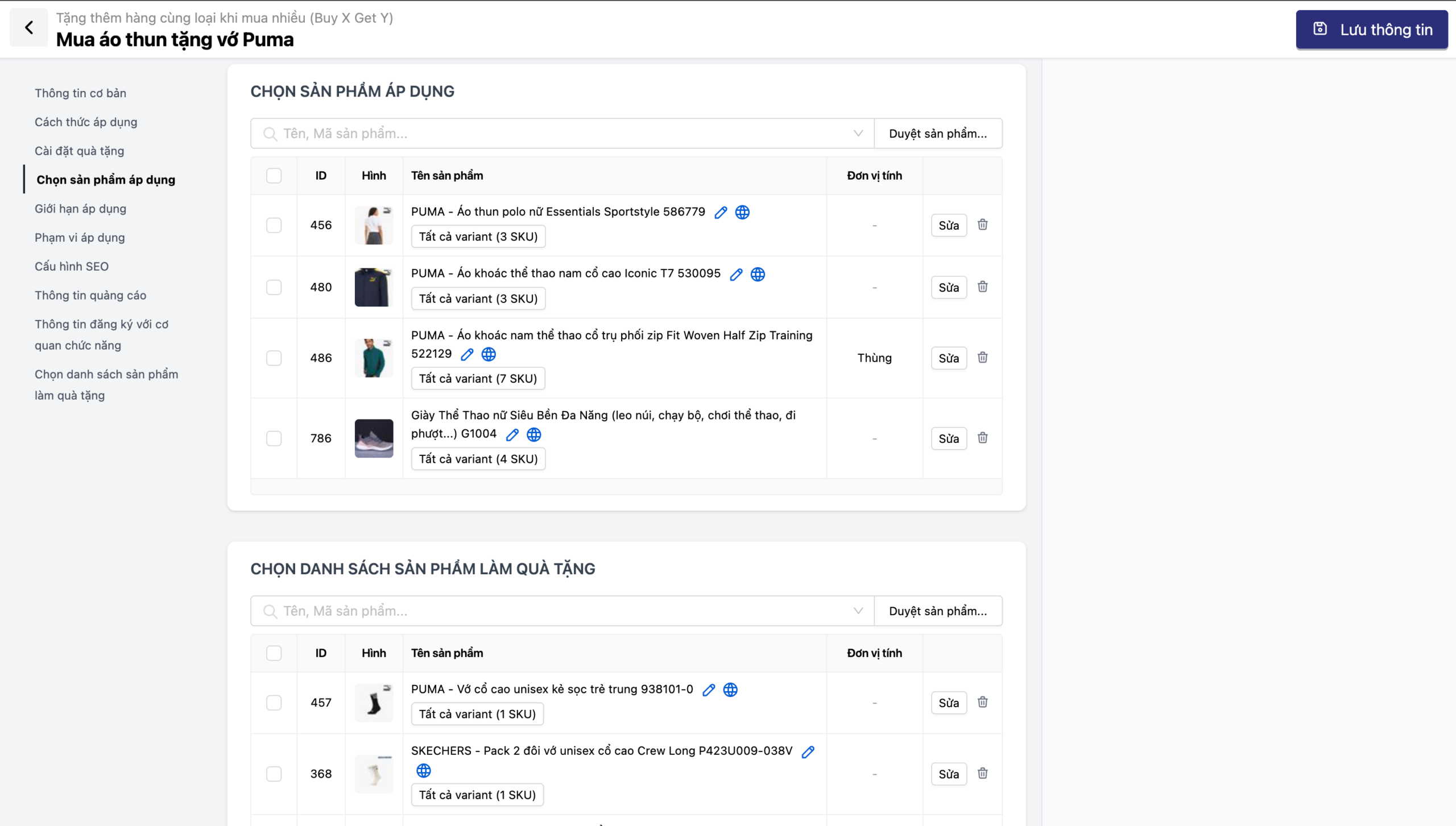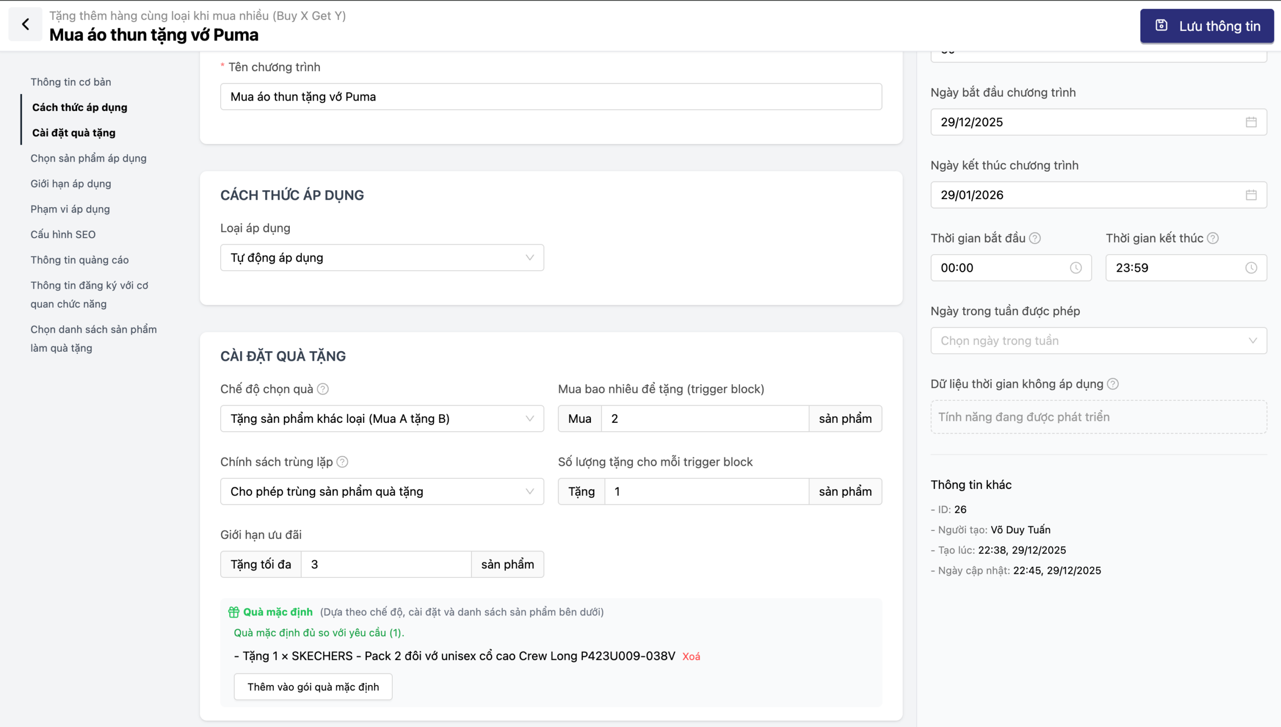 Chỉ định danh sách quà tặng: Bạn có quyền chọn chính xác SKU quà tặng (ví dụ: vớ unisex cổ cao) để hệ thống tự động xuất kho khi có đơn hàng thỏa điều kiện.