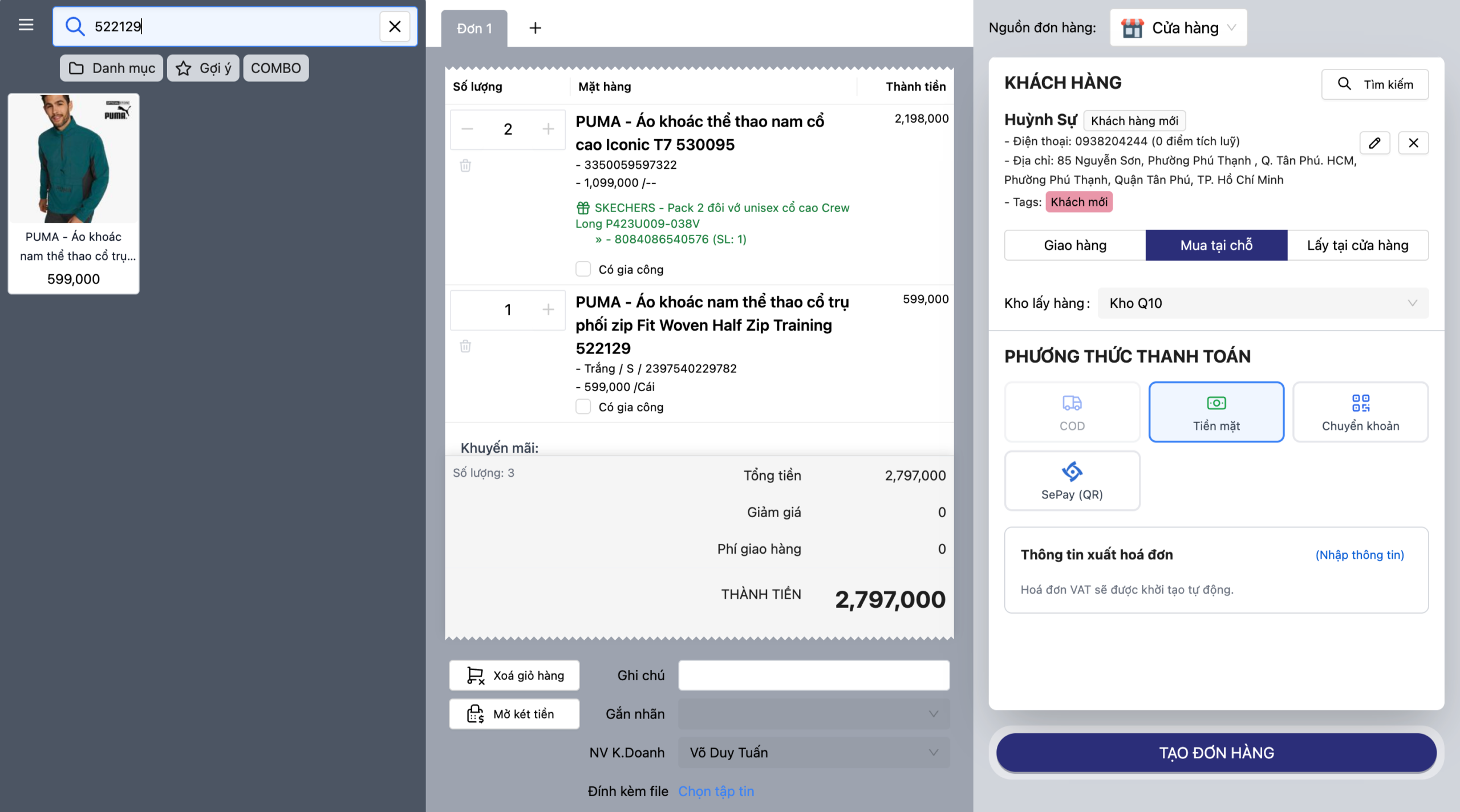 Nhận diện quà tặng tức thì: Ngay khi nhân viên quét đủ số lượng sản phẩm điều kiện (ví dụ: 2 áo khoác), hệ thống sẽ tự động thêm sản phẩm quà tặng vào đơn hàng với giá 0đ.
