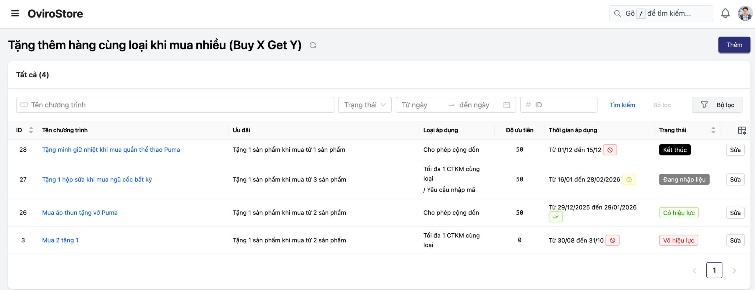 Trạng thái chương trình: Dễ dàng theo dõi các chương trình đang “Có hiệu lực”, “Kết thúc” hoặc “Vô hiệu lực” để điều chỉnh kịp thời.