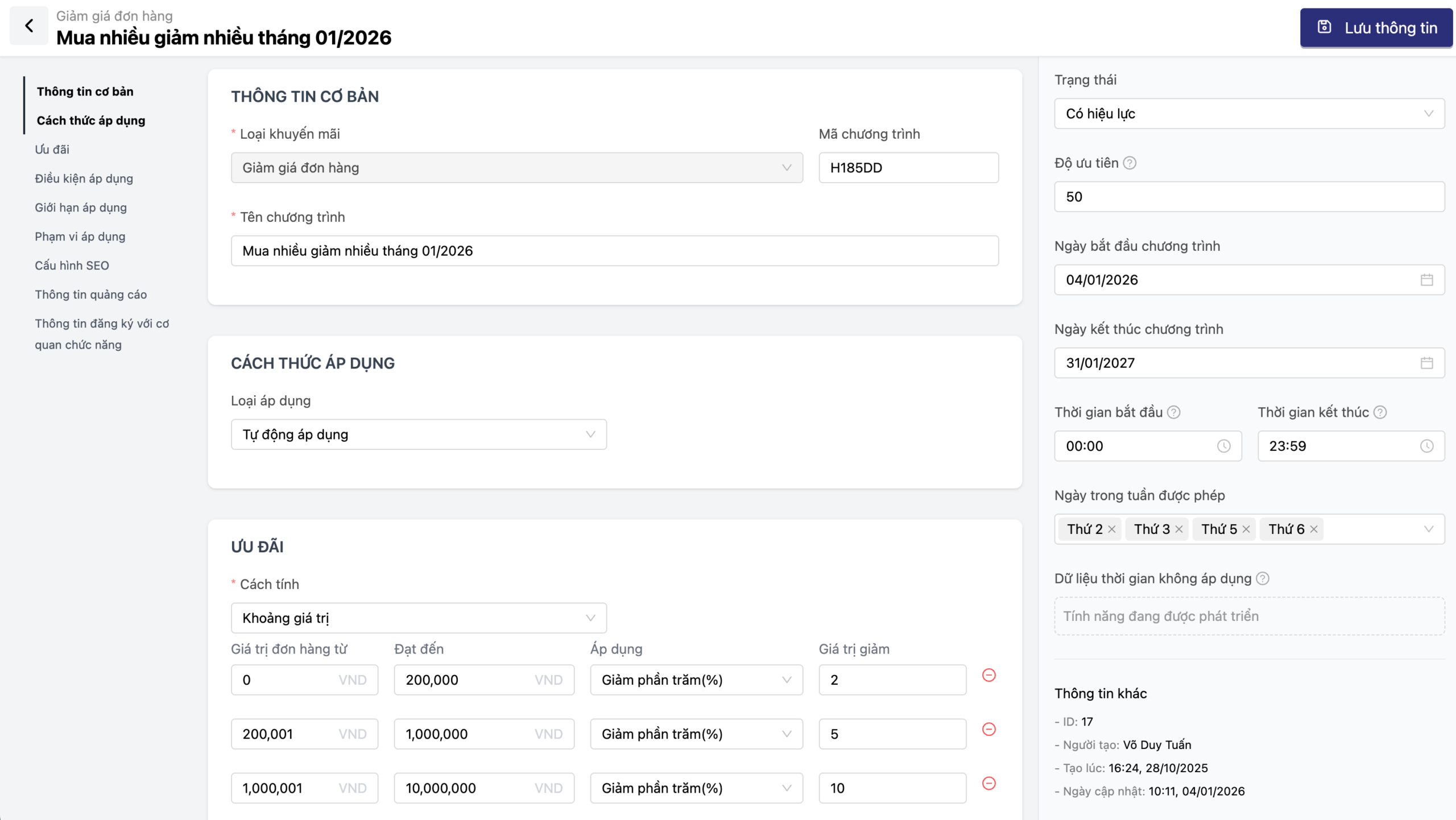 Cài đặt thời gian: Chỉ định chính xác ngày bắt đầu, ngày kết thúc và khung giờ áp dụng ưu đãi.