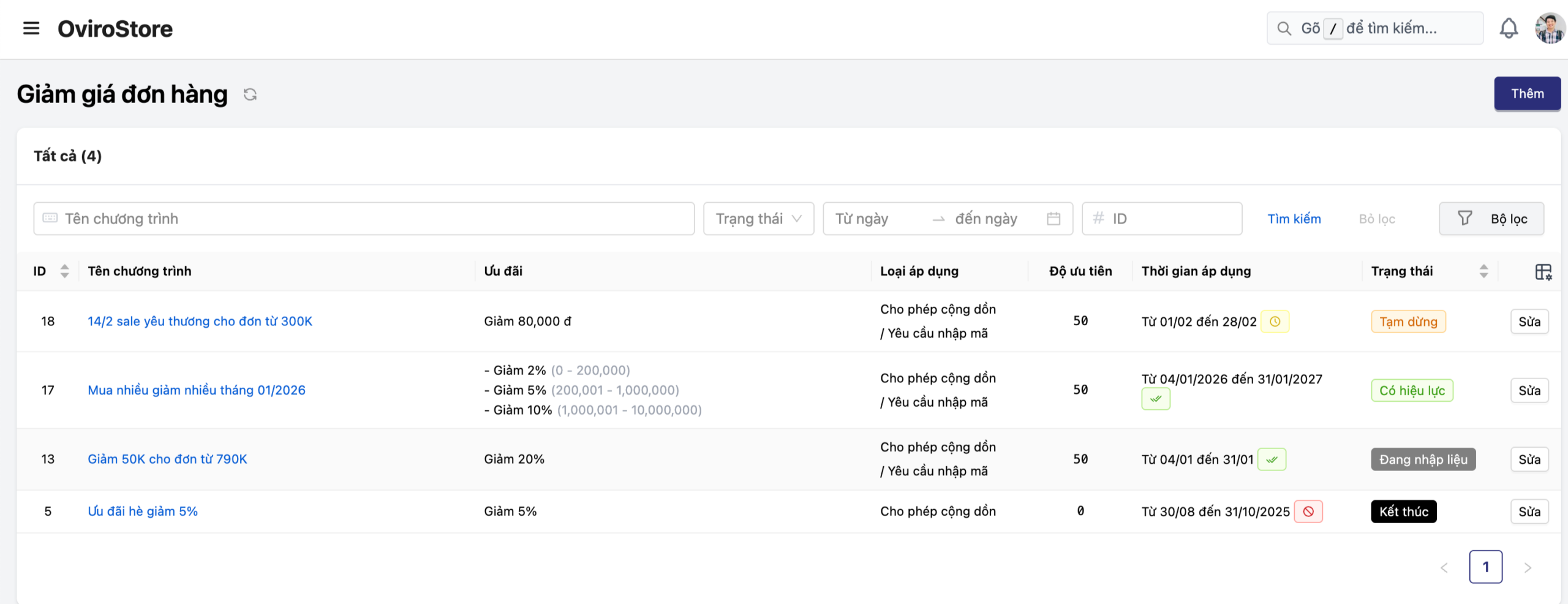 Theo dõi trạng thái: Dễ dàng kiểm soát các chương trình đang “Có hiệu lực”, “Tạm dừng” hoặc “Kết thúc” ngay trên màn hình danh sách.