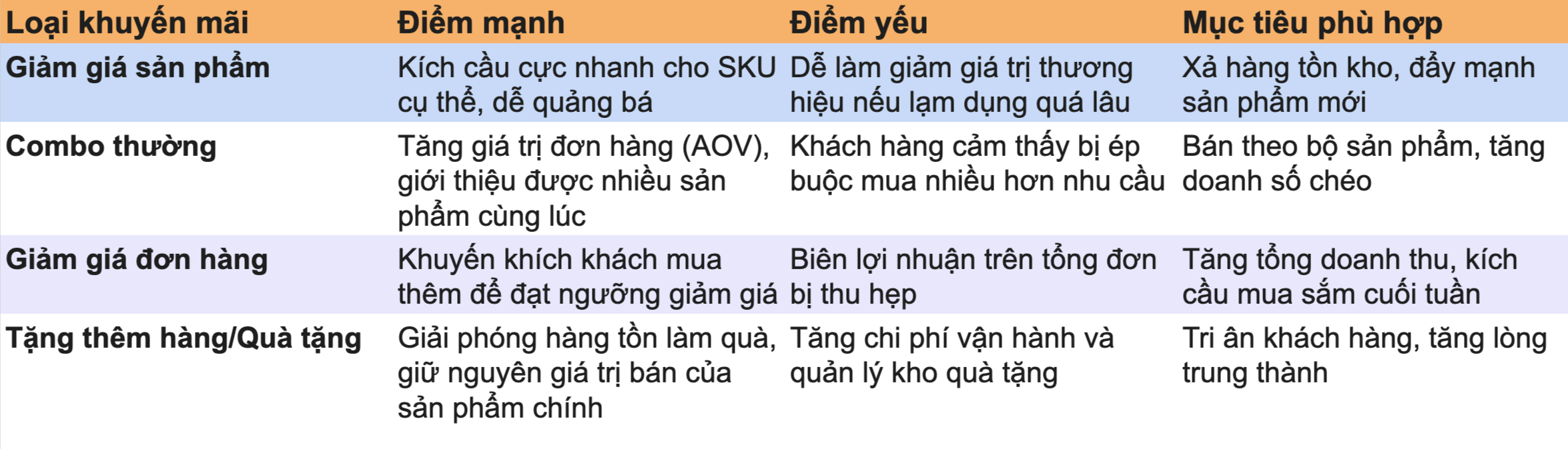 Dưới đây là bảng so sánh chi tiết các chương trình khuyến mãi phổ biến nhất hiện nay.