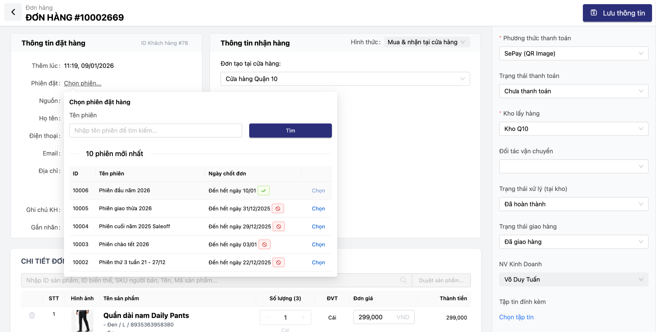Gán phiên nhanh chóng: Khi tạo đơn hàng mới, nhân viên có thể chọn trực tiếp từ danh sách các phiên mới nhất để đảm bảo tính chính xác.