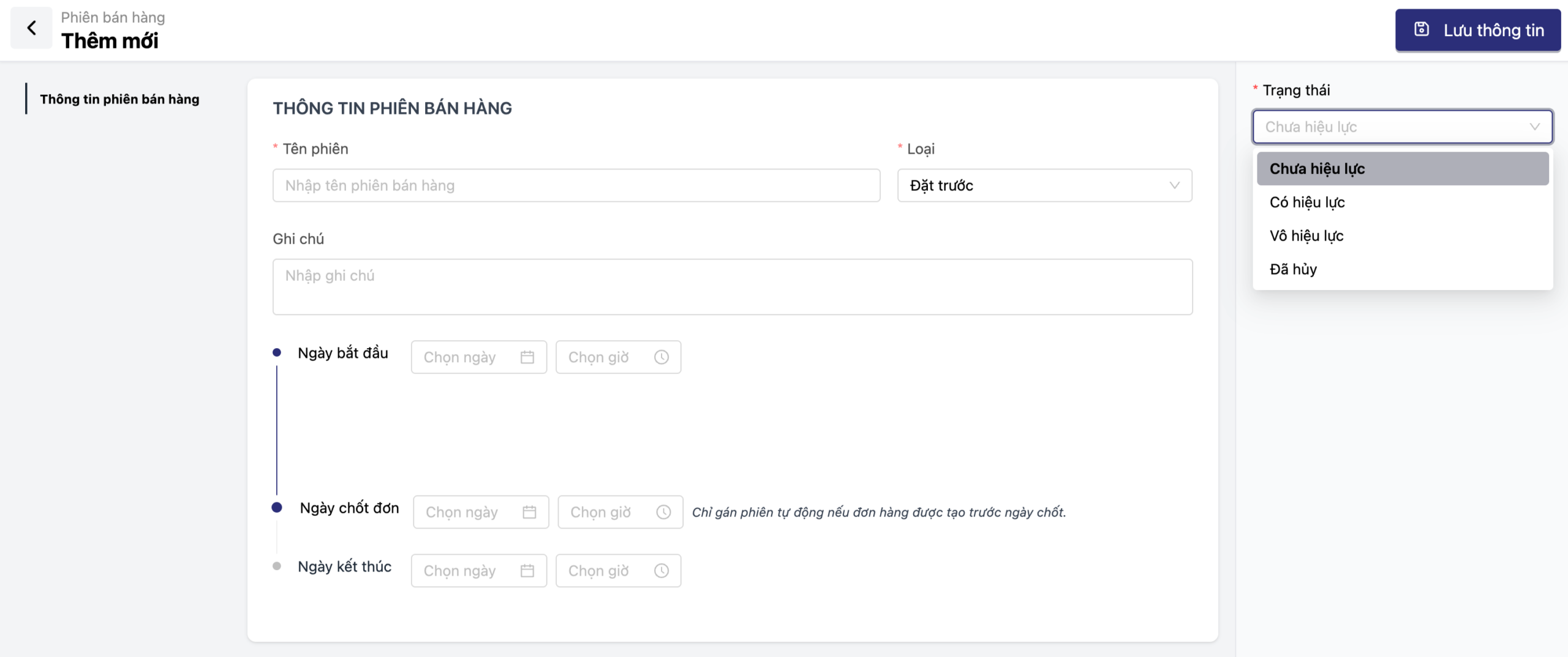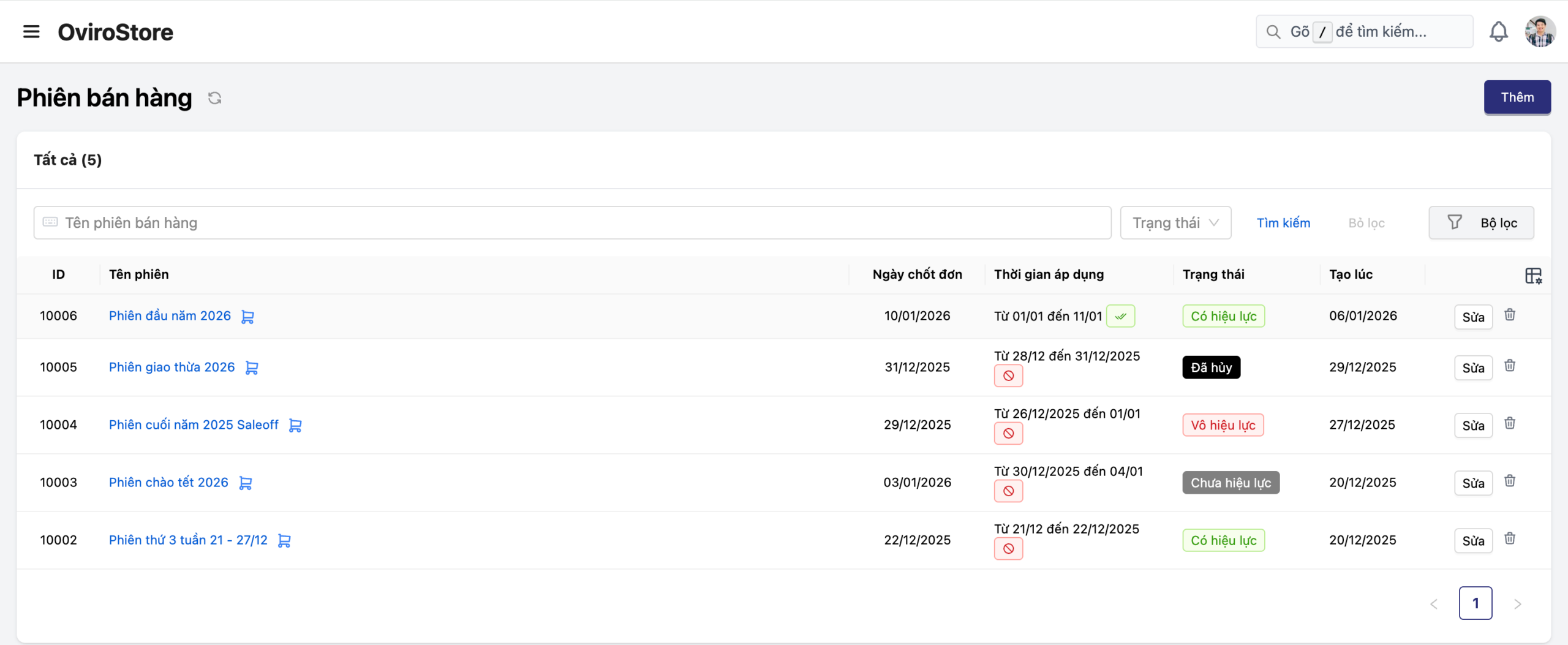 Phiên bán hàng (Sales Session) là một khoảng thời gian xác định mà doanh nghiệp thiết lập để triển khai một đợt bán hàng cụ thể. Trong hệ thống Oviro, mỗi phiên bán hàng sẽ bao gồm các thông tin quan trọng như: tên phiên, loại phiên (ví dụ: Đặt trước), ngày bắt đầu, ngày chốt đơn và ngày kết thúc.