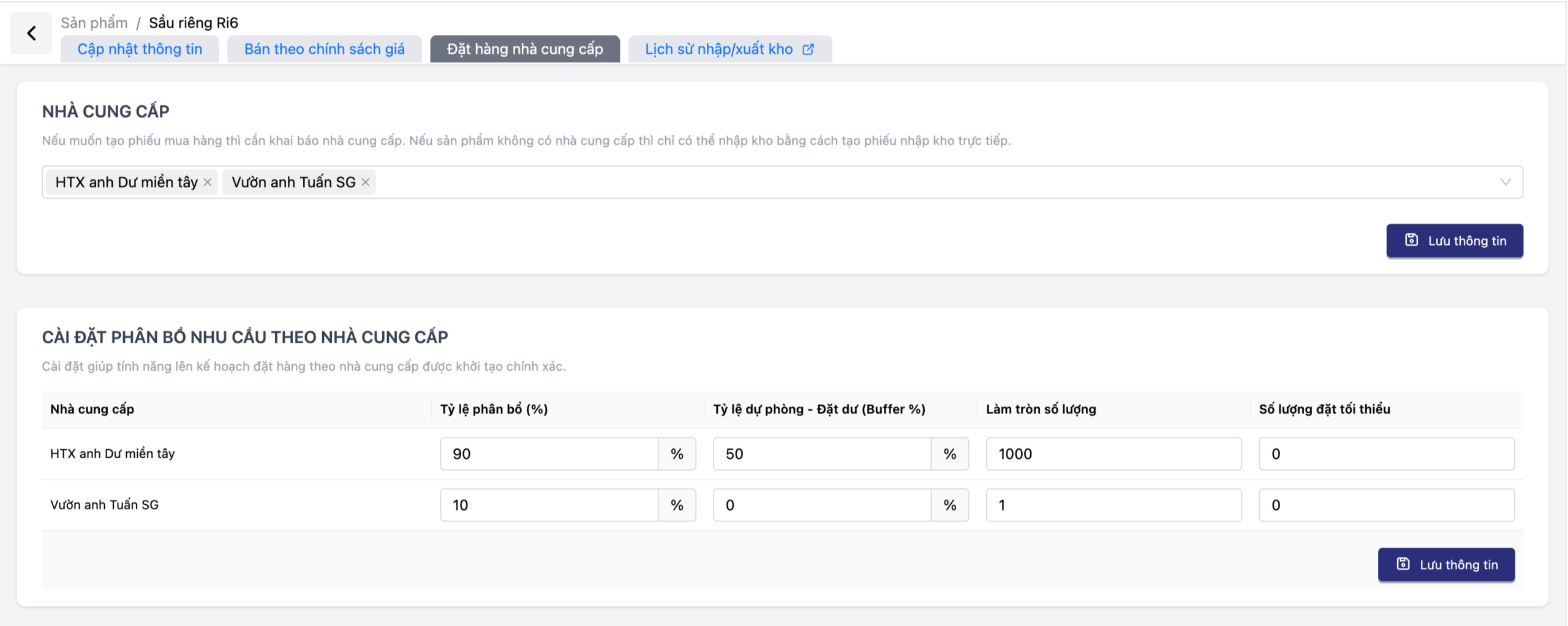 • Phân bổ nhu cầu theo tỷ lệ (%): Bạn có thể cài đặt tỷ lệ nhập hàng giữa các nhà cung cấp (ví dụ: 90% từ nguồn chính và 10% từ nguồn dự phòng) để đảm bảo an toàn hàng tồn kho.