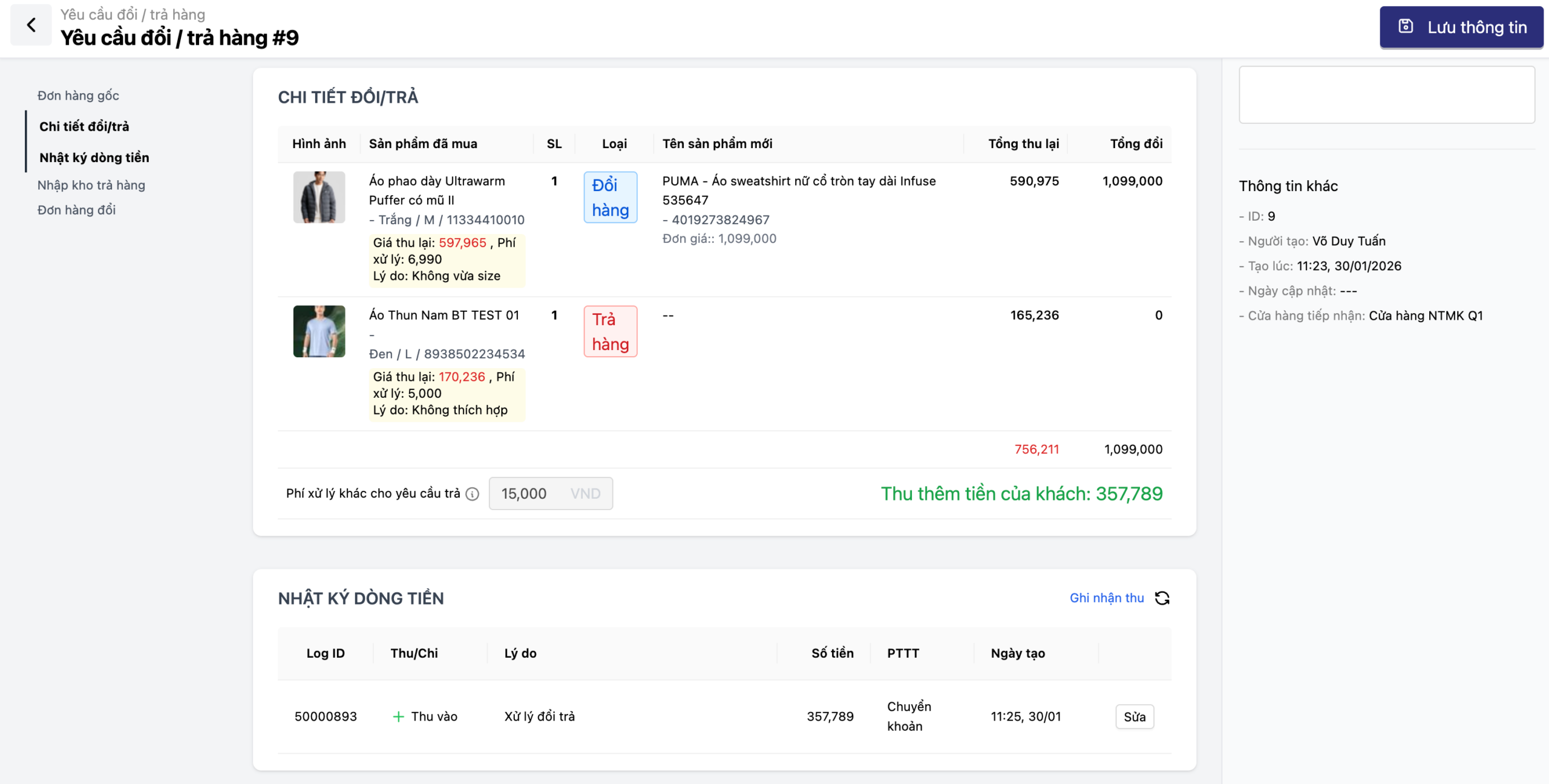 • Hình thức xử lý: Đổi sản phẩm khác, trả lại tiền, hoặc tạo phiếu ghi nợ.