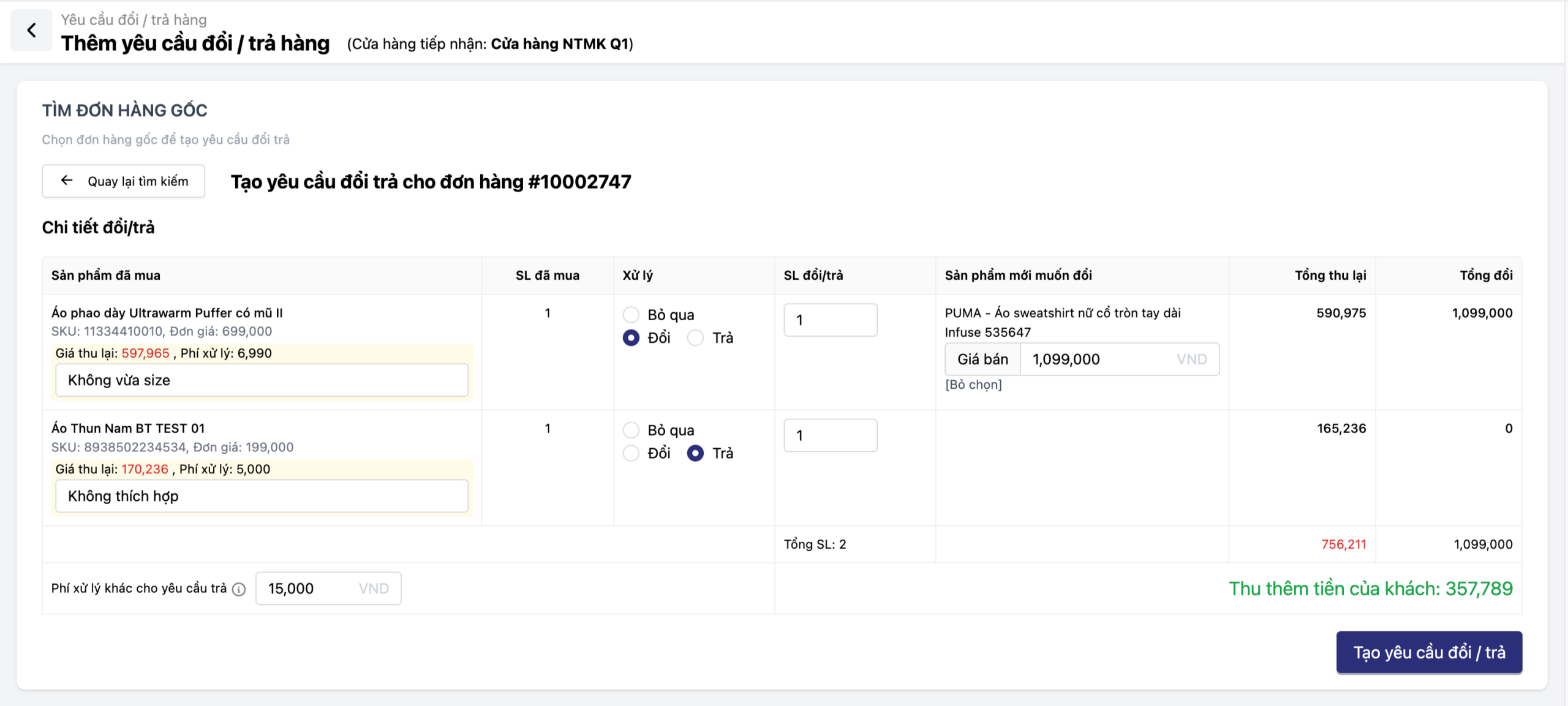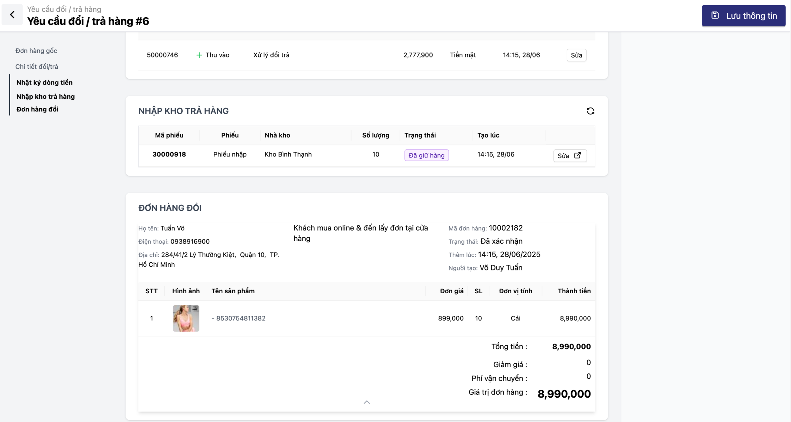 • Chi tiết sản phẩm muốn đổi/trả: Tên sản phẩm, mã SKU, số lượng, giá bán.