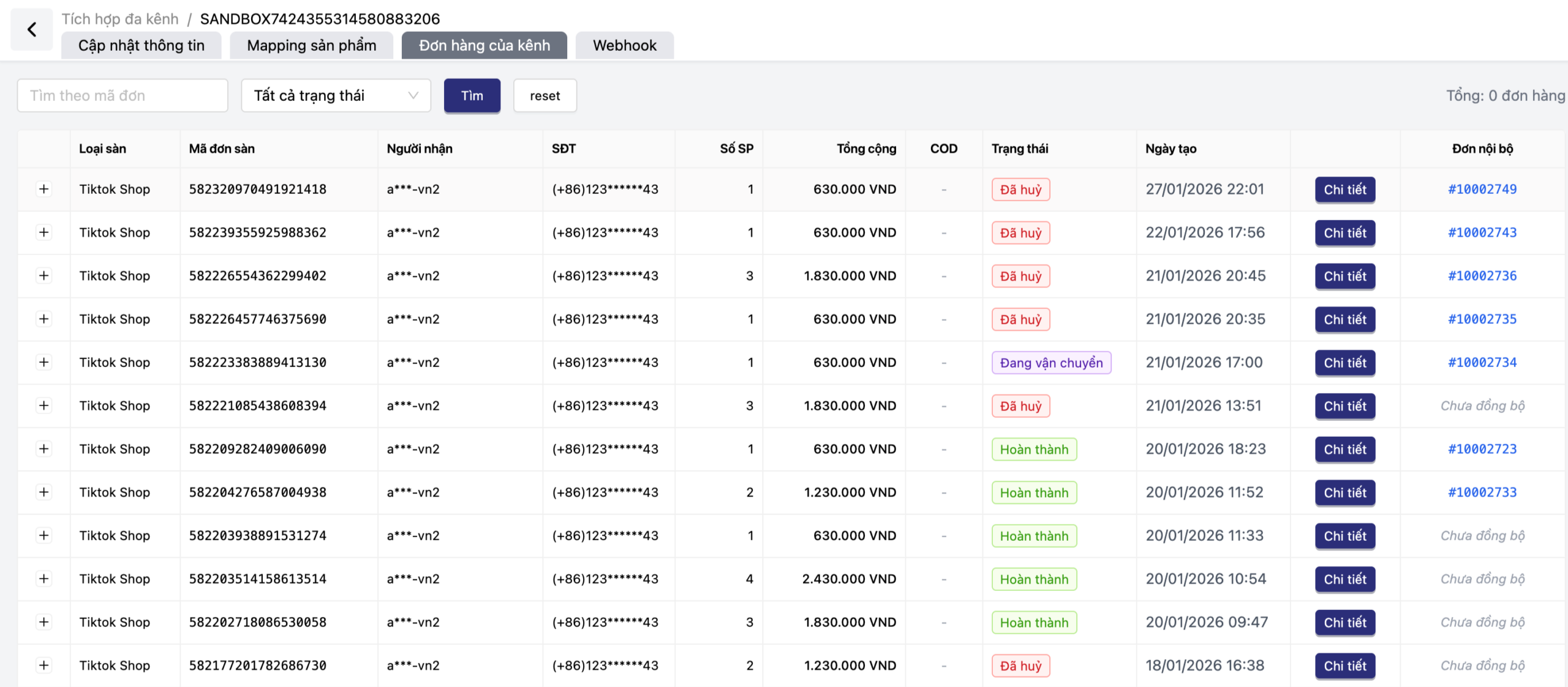 Thông tin chi tiết: Admin có thể xem toàn bộ mã đơn sàn, tên người nhận (đã mã hóa bảo mật), số điện thoại, tổng cộng số tiền và trạng thái thanh toán (ví dụ: đơn “Hoàn thành” hoặc “Đã hủy”).