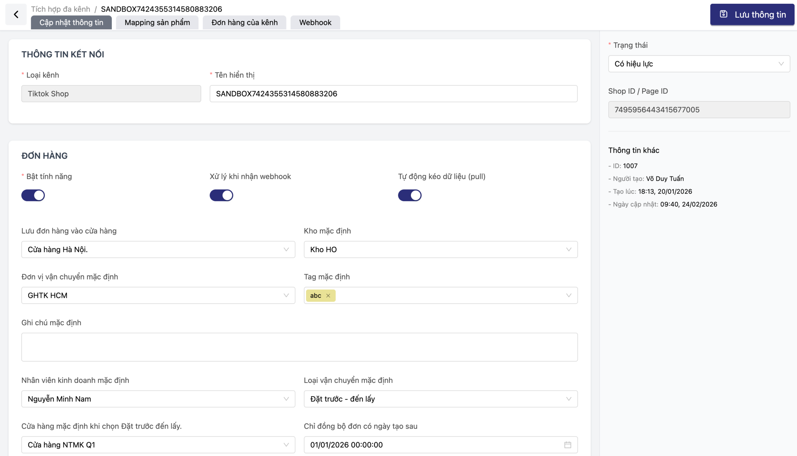 Lưu đơn hàng vào cửa hàng cụ thể: Ví dụ, ưu tiên đẩy đơn TikTok về kho Hà Nội hoặc kho HCM để tối ưu vận chuyển.