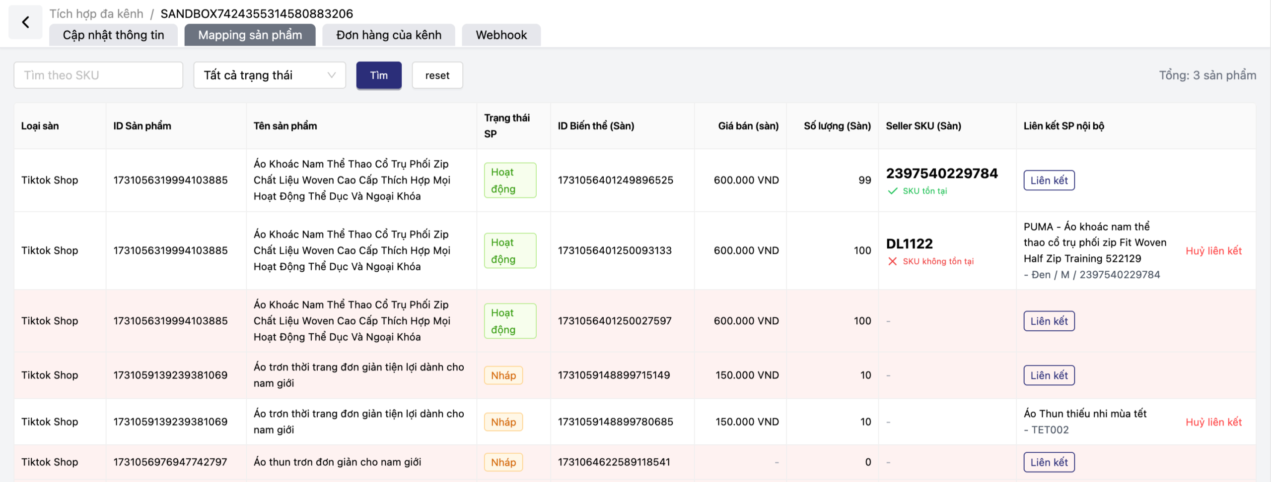 Admin có thể dễ dàng liên kết một sản phẩm trên TikTok (ví dụ: “Áo Khoác Nam Thể Thao…”) với mã SKU nội bộ tương ứng trong Oviro (ví dụ: “PUMA – Áo khoác nam…”).
