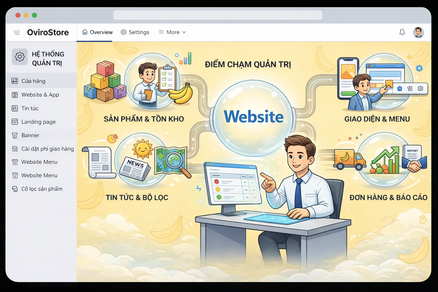 Một trong những ưu điểm lớn nhất của Oviro chính là khả năng tập trung hóa. Bạn không cần biết lập trình, không cần thuê kỹ thuật viên riêng mỗi khi muốn thay đổi một dòng thông báo trên web. Tất cả các tính năng cốt lõi của một website bán hàng hiện đại đều được quản lý trực quan trong menu Website & App của hệ thống Oviro.