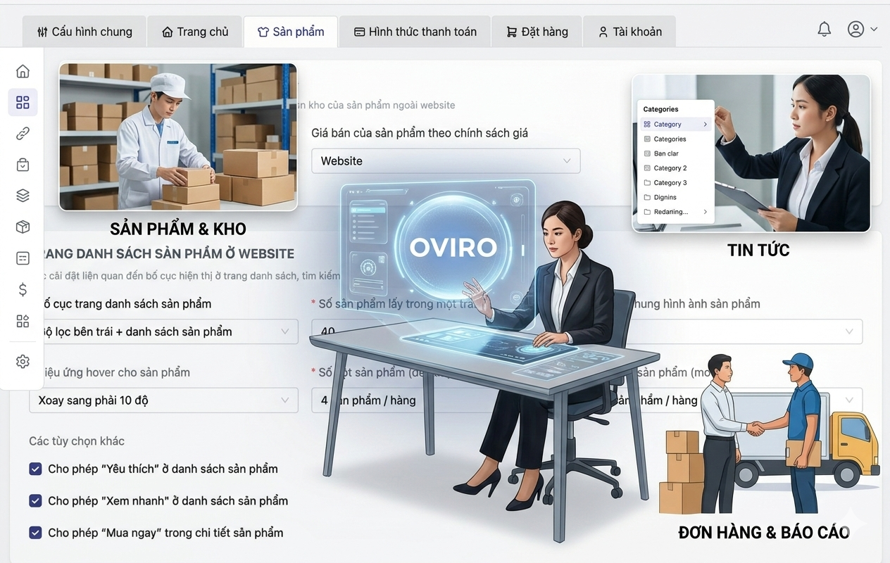 Quản trị website bán hàng giờ đây không còn là nỗi ám ảnh về kỹ thuật. Với Oviro, bạn có thể dành 90% thời gian để tập trung vào chiến lược kinh doanh và chăm sóc khách hàng, thay vì loay hoay với các nút bấm phức tạp. Từ việc thay đổi một banner khuyến mãi đến việc đồng bộ hàng ngàn SKU sản phẩm lên TikTok Shop hay Website, tất cả đều được thực hiện mượt mà trên một nền tảng duy nhất.