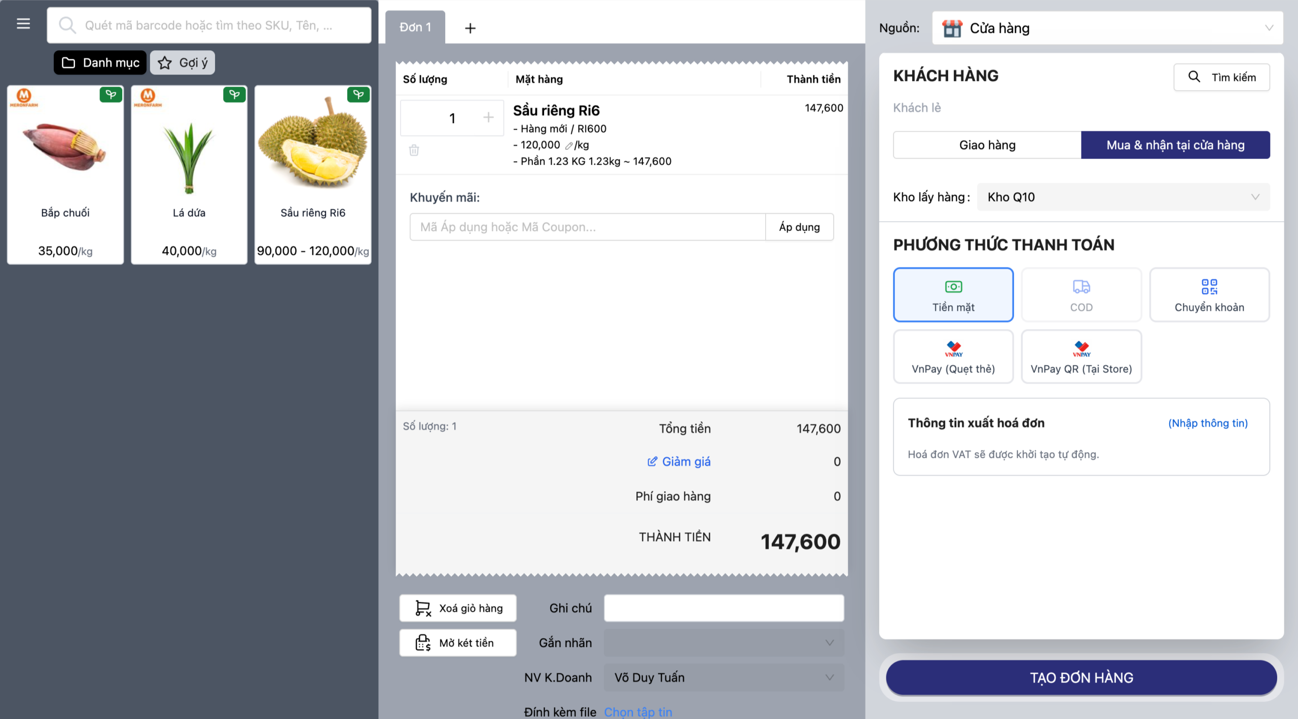 Quản lý kho chính xác: Khối lượng tồn kho được trừ trực tiếp theo số Kg thực tế đã bán (Ví dụ: Tồn kho sầu riêng giảm đúng 1.234 Kg sau khi đơn hàng hoàn tất).