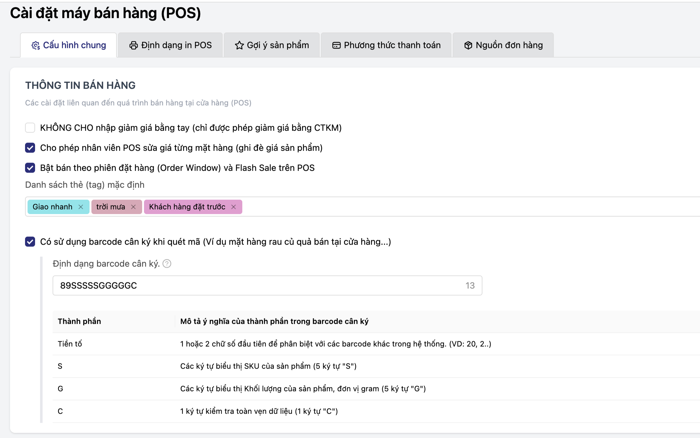 Tại phần Cài đặt máy bán hàng (POS), bạn có thể kích hoạt tính năng “Có sử dụng barcode cân ký khi quét mã” và thiết lập định dạng chuẩn (ví dụ: 89SSSSSGGGGGC):