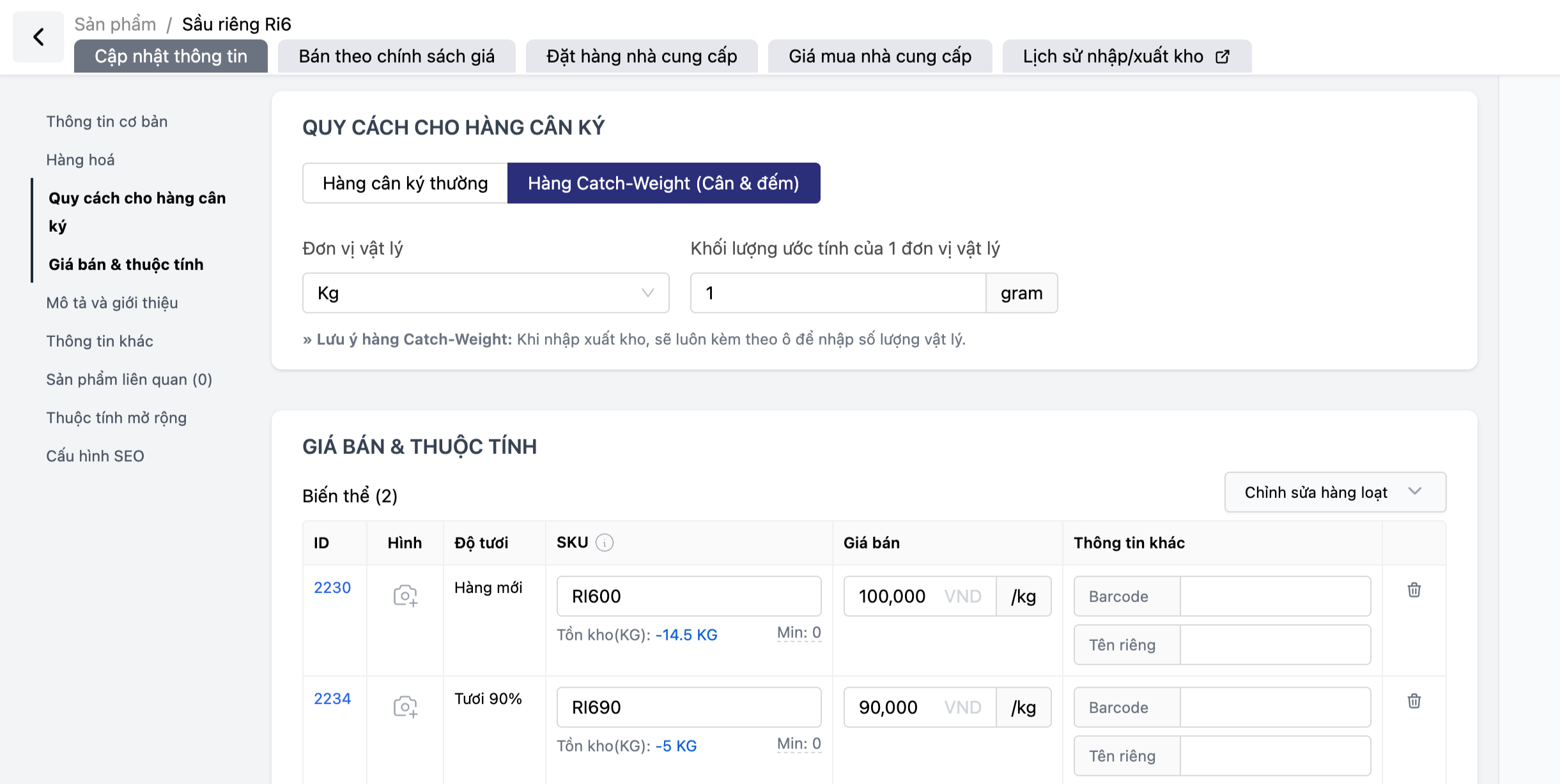 Quản lý biến thể: Bạn có thể tạo nhiều mã cân cho cùng một loại sản phẩm dựa trên độ tươi hoặc SKU khác nhau (Ví dụ: RI600 cho hàng mới, RI690 cho hàng tươi 90%) với các mức giá bán tương ứng trên mỗi Kg.
