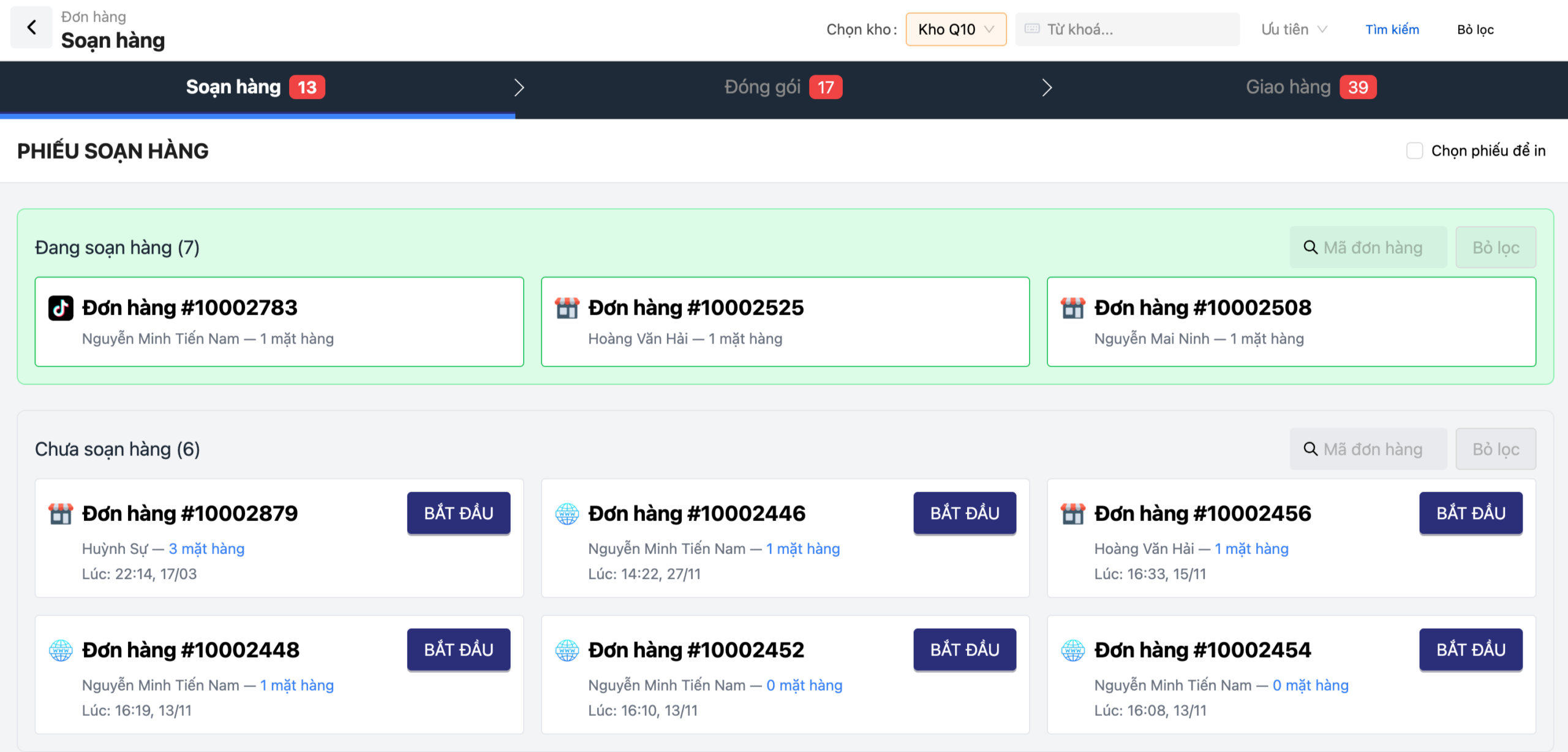 Phiếu đang soạn: Nhân viên đang trực tiếp lấy hàng tại kho. Việc phân loại này giúp điều phối nhân sự hợp lý, tránh tình trạng đơn hàng bị “ngâm” quá lâu.