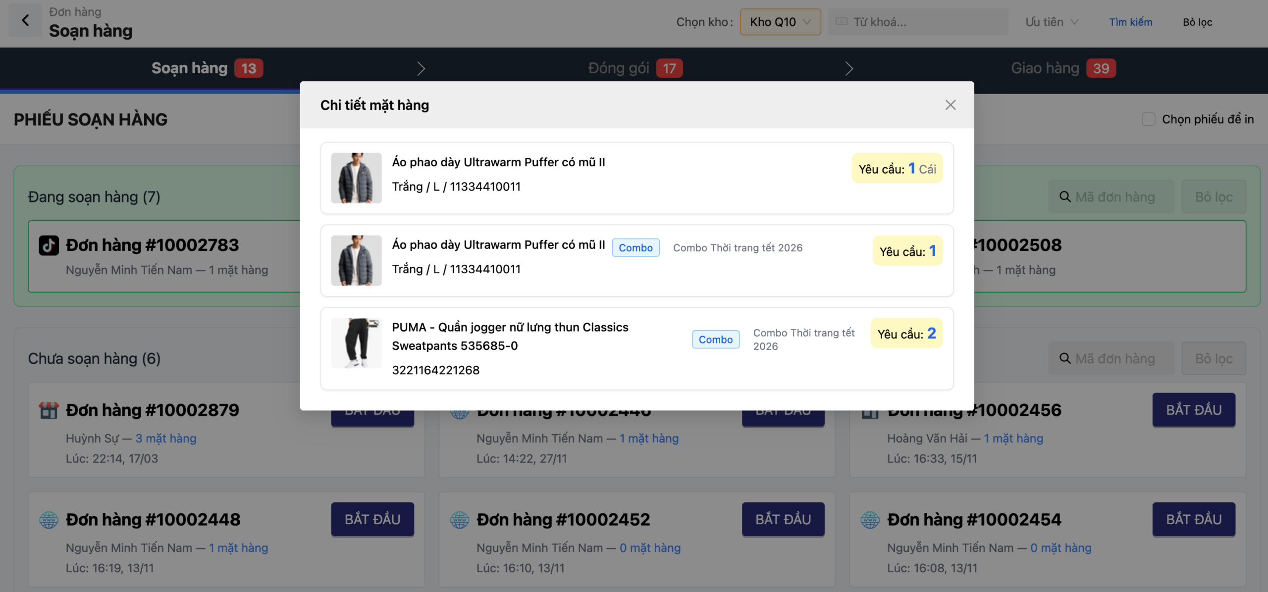 Đây là bước quan trọng nhất để tránh đóng gói sai sản phẩm. Khi nhân viên nhấn “Bắt đầu”, hệ thống sẽ hiển thị chi tiết: