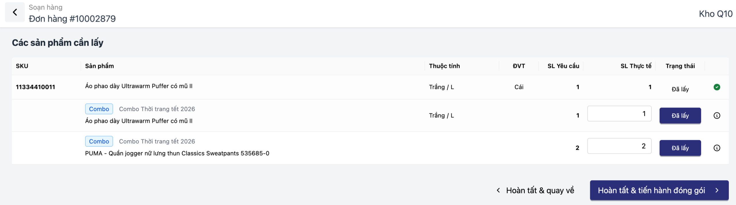 Trạng thái từng món hàng (Đã lấy/Chưa lấy). Điều này giúp nhân viên kho tự kiểm tra (double-check) ngay trong lúc nhặt hàng, đảm bảo tính chính xác tuyệt đối trước khi chuyển sang khâu đóng gói cuối cùng.