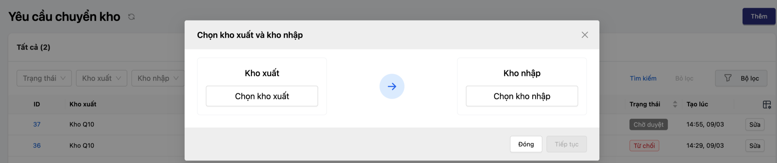 Mọi yêu cầu điều chuyển đều bắt đầu bằng việc xác định rõ ràng nguồn gốc và đích đến. Giao diện Oviro cho phép người dùng chọn nhanh Kho xuấtKho nhập.