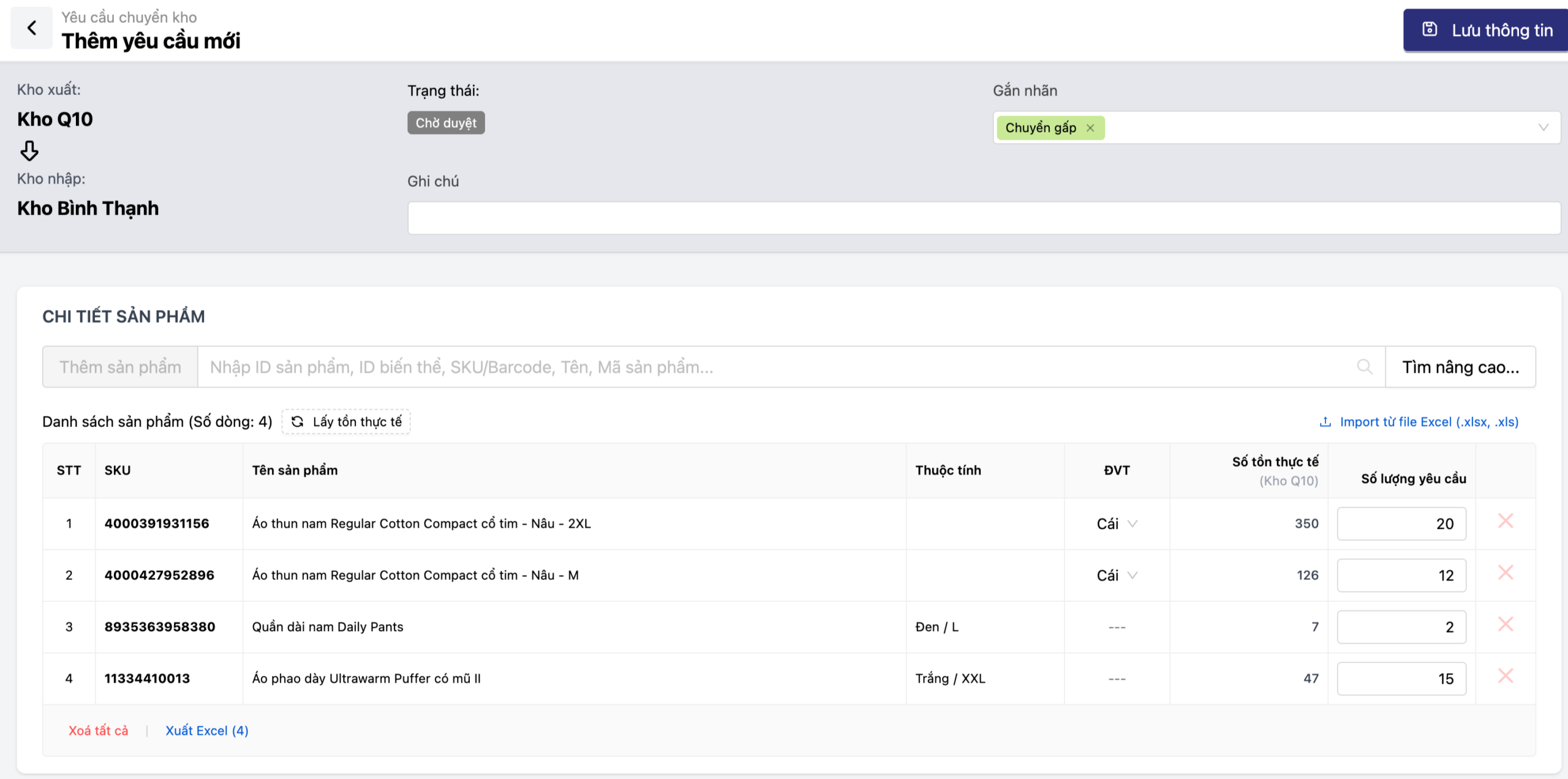 Tại màn hình “Thêm yêu cầu mới”, người quản lý sẽ chọn các mã SKU cần chuyển.