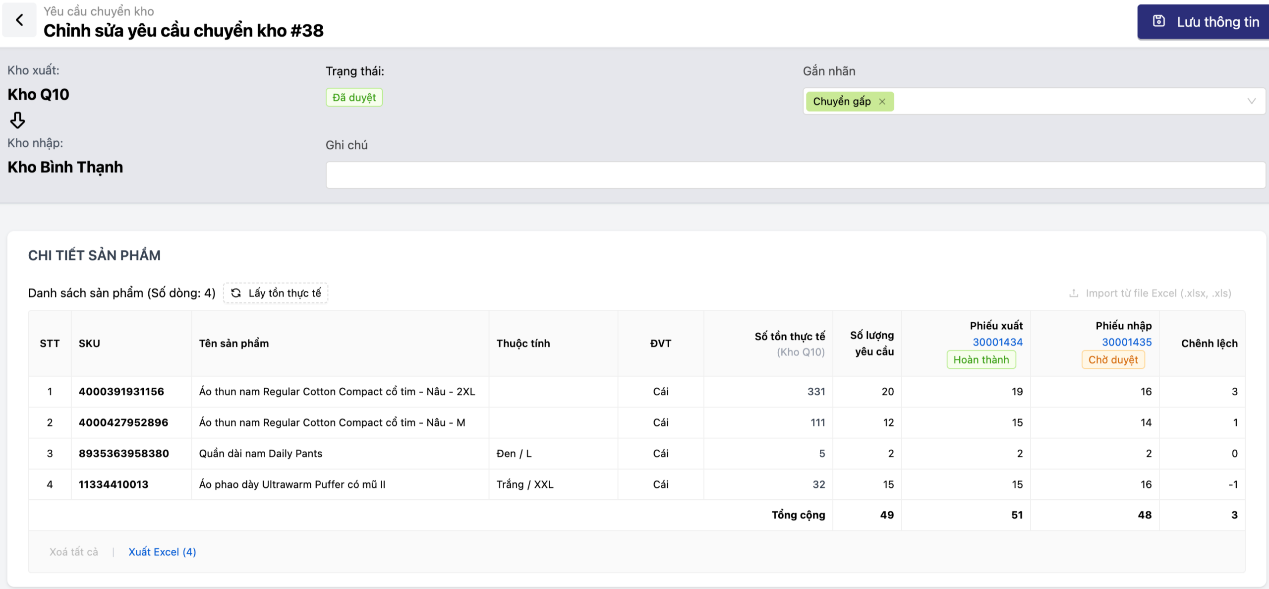 • Trạng thái: Lúc này, hàng hóa tại kho xuất sẽ được đưa vào trạng thái “chờ xuất” hoặc “tạm giữ” để đảm bảo tồn kho thực tế không bị bán chồng chéo.