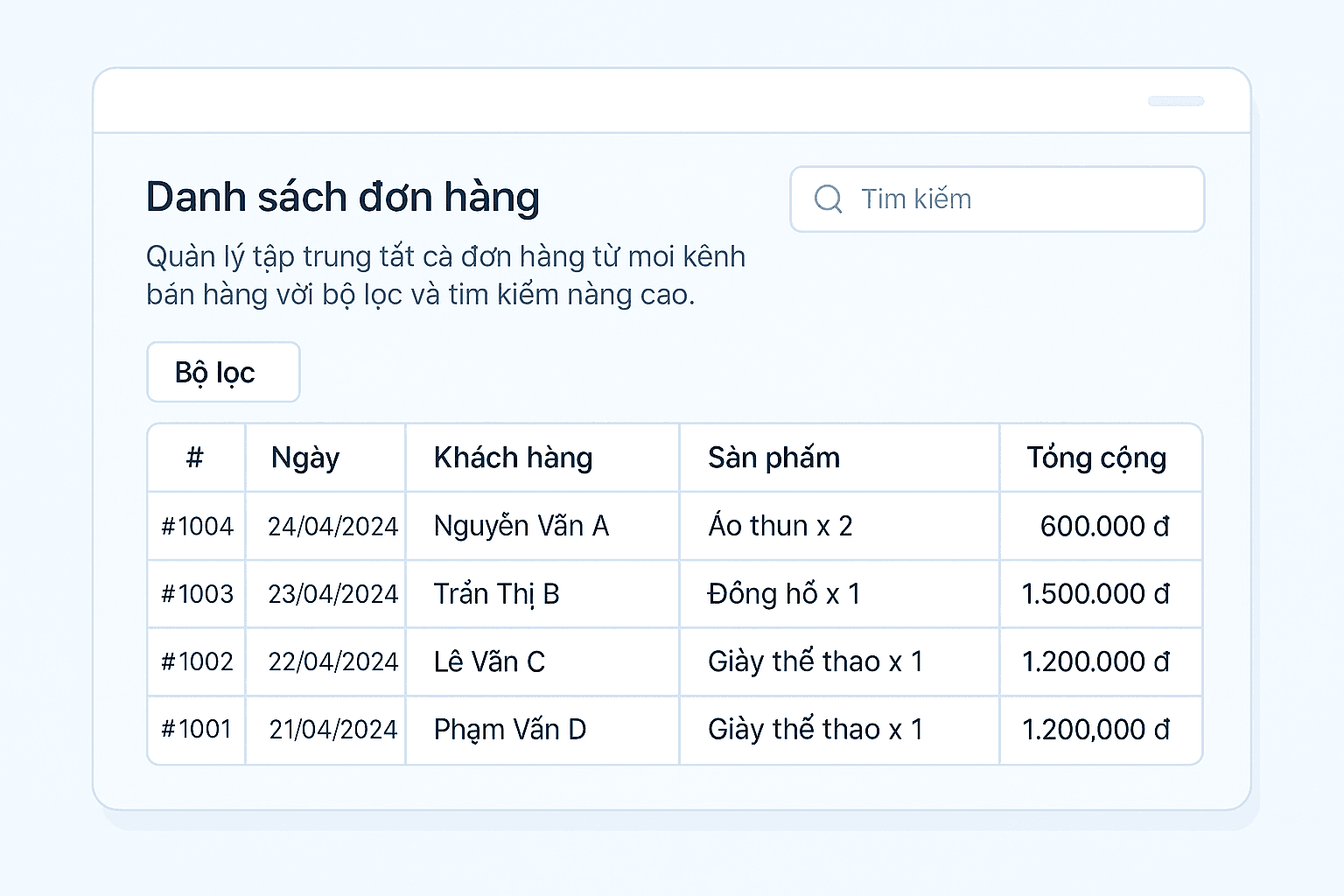 Tập trung mọi đơn hàng từ website, sàn TMĐT, cửa hàng vào một nơi – dễ theo dõi, dễ xử lý.